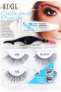 Glam up your eyes with these gorgeous lashes! The Ardell 105 lashes offer a long glamorous look, are easy to apply and are even reusable! Work best for large and deep set eyes. Deluxe pack includes 2 pairs of lashes, clear white DUO adhesive and a lash applicator. Perfect for your next special occasion or night out!Style Number/Barcode: 07307-0222