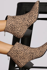 Keep it fierce in this wildly inspired leopard print booties! They feature an around the ankle fit, a back zipper closure, a pointed toe and a low stacked heel. Booties are composed of a canvas-like material and felt accents.