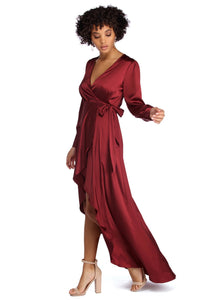 Special OccasionSlay in satin as your radiate a romantic look in our alluring Lola dress! She features a rich burgundy hue, a plunging wrap V neckline, long bishop sleeves with a triple row button cuff and a cinching tie waist belt. Her slim fit bodice leads to a dramatic high low silhouette to show off your heel glam! Dress is composed of a smooth satin fabric that offers a form hugging fit with minimal stretch.