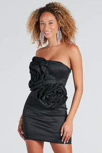Capture the romance in the dreamy and chic Sophia formal rose applique mini dress. She features a strapless straight-across neckline, statement rosette appliques at the bodice and hip, flexible boning inserts at the bodice, a mini-length hem, and a form-hugging fit. The smooth taffeta fabric includes a sewn-in knit lining.