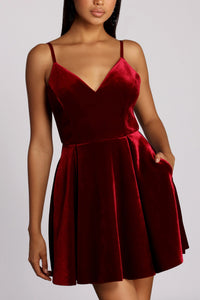 Special OccasionA rich ruby-red hue and gorgeous bonded velvet texture lend our Lily dress its effortless elegance. She features adjustable spaghetti straps, a V neckline, a seamed bodice with back zip, and a gently pleated A-line skirt with pockets. Lily is fully lined and made from a thick, heavier-weight velvet material with a touch of stretch.