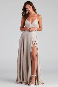 Sparkly and sultry, the Lizzie glitter formal dress is designed to captivate every guest at prom! She stuns in a classy, sleeveless, V-neckline, princess seams on the bodice, adjustable spaghetti straps so you can customize her fit, and side pockets perfect for keeping your hands warm. Make heads turn everywhere you go thanks to the caged-back detail that radiates a femme allure atop the A-line silhouette that effortlessly kisses the floor and features a sexy high-cut front slit. Complete your prom look in elegant earrings and a dainty bracelet.