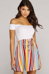 Rendered in bright stripes, this mini makes an impact. Dress features a fitted bodice with off-the-shoulder neckline, contrast gently pleated, A-line skirt, and a gathered elasticized waist with decorative tie. Dress is made from a soft, lightweight woven material with stretch through the bodice and waist.