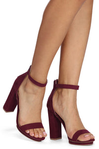 Strut it out in simple block heels! Perfect for that brunch date, that upcoming wedding or a chic workwear outfit—these heels are a must! They feature an ankle strap, a zip-up back, an open almond toe, a high block heel, an island platform for added comfort, and a faux suede material. Complete look with a casual dress and a dainty layered necklace.