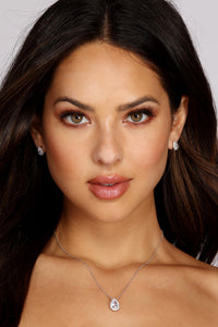 This sophisticated cubic zirconia necklace and stud earrings set will dazzle up the room. The necklace's dainty chain leads to a center teardrop charm. The pack also comes with gorgeous matching teardrop stud earrings so you can wear them together for a beautiful look. Accessorize with this set for brunch with the girls! Pair with a flirty floral dress and cute wedges.