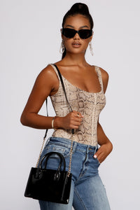 Feeling luxe? Show off with a chic tote that gives off major luxe vibes. The tote features a mini square design, top handles, and composed of a faux patent leather material. Complete your look with sunnies and a statement top.