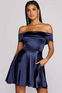 You're known for your moves—make 'em in our dynamite midnight blue satin Jess dress! She features an off-the-shoulder neckline, seamless sleeveless bodice with fold-over detail and back zip, and an A-line flared mini with pockets at either hip. Jess is made from a smooth, shiny material with moderate stretch.