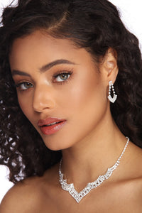 Dazzle like royalty in this beautiful silver rhinestone set! Necklace has an intricate scalloped design with a lobster clasp closure. Matching earrings have a tear drop outline shape and a post back closure.