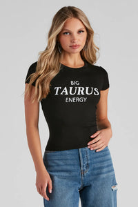 Let this graphic tee do the talking! It features a classic crew neckline, short sleeves, a front script that reads, "Big Taurus Energy" and a fitted crop hem. Complete the look in trendy distressed jeans for a casual vibe.