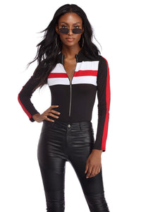 Get strapped in and ready to ride in this moto-inspired bodysuit! It has a mock neckline, a full zip up front, long fitted sleeves, and wide contrasting stripes. Bodysuit has a thong bottom with snap button closures. Garment is composed of a soft knit fabric that offers a moderate stretch.