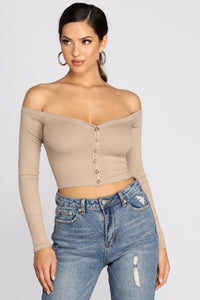 Show off a little shoulder action with this essential basic ribbed top! It features an off the shoulder neckline and a button-down front. Add this staple piece to your closet to pair with your favorite denim and chunky sneakers to wear to a coffee date with your squad.