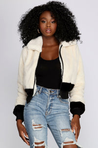 Color block it up in this trendy chic faux fur jacket! It features a collar, a zip front, long sleeves with ribbed cuffs, front pockets, a cropped ribbed cuffed hem, and a stylish color block pattern with a contrasting hue on the bottom. Jacket is composed of an ultra soft faux fur fabric with a smooth woven lining.