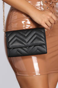 Meet your new everyday bag. This quilted faux leather clutch features a modern chevron design with a button flap top closure. Includes interior card slots and a detachable gold chain for shoulder wear.